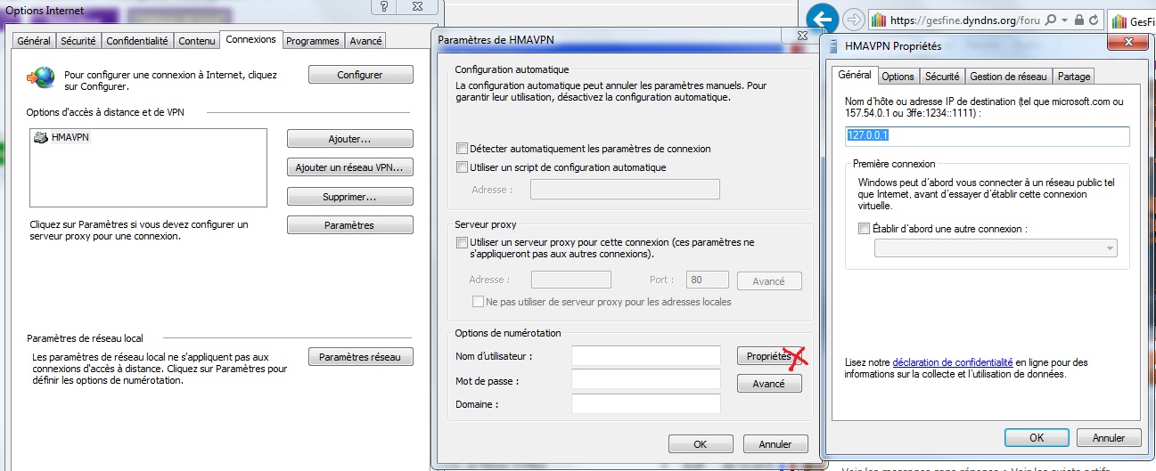 Dans son paramétrage,je ne retrouve pas les parametres proxy dont tu parles mais ceux du VPN (fichier joint): double clic sur HMAVPN me donne fenetre du milieu, double clic sur proprietes => image de droite... Ca ne doit pas etre ce que tu proposes ?