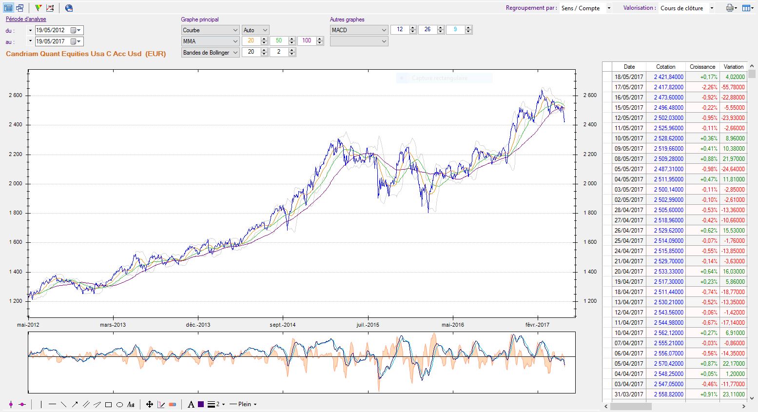 et je n'ai eu aucune difficulté pour importer avec la source "Boursorama Clôture" 5 années de cours pour chacun des deux titres.