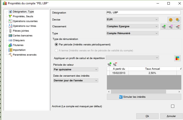 J'avais bien paramétré comme vous l'indiquez. Voici, une photo d'écran. Peut-etre me suis je mal exprimé? Je fais une reprise de mes comptes sous gesfine et comme le PEL commencait en 2013, je pensais qu'il aurait calculé tous les intérêts annuels depuis, comme il a d'ailleurs généré les versements mensuels que j'avais paramétrés.