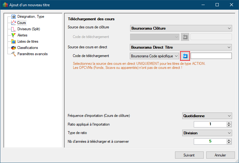 Dans la rubrique cours d'un titre, tu choisis pour les cours en direct la source "Boursorama Code spécifique" (si cette source n’apparaît pas dans la liste, pense à la récupérer sur le serveur dans la rubrique "Code de téléchargement") et tu cliques sur l'icône juste à sa droite comme illustré ci-après : Cela va te renvoyer la liste des codes de téléchargement et il te suffira de cliquer sur le bouton "Clic" de la ligne que tu souhaites, en l’occurrence ici la ligne 1 pour le marché Euronext Paris pour insérer sa valeur dans le champ adéquat : Bonne continuation avec GesFine, et si tu penses que le sujet est clos pense à le clôturer comme indiqué dans ma signature.