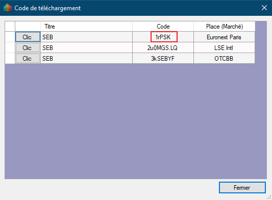 Ce code spécifique commence par 1rP et les lettres finales se trouve sur la fiche valeur sur Boursorama. Dans le cas de SEB = SK, d'où code 1rPSK.