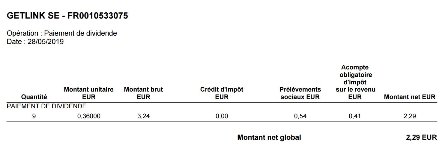 Ci-joint exemple de dividendes Eurotunnel avec les prélèvements sociaux et avance d'impôts.