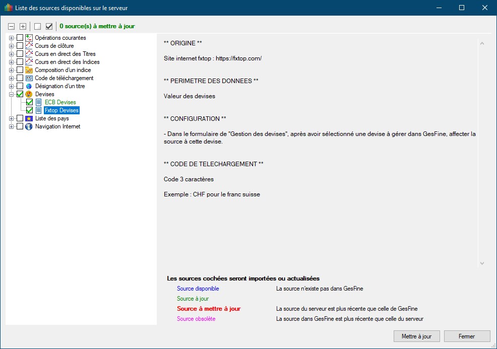 Ouvre le formulaire des sources et à l'aide du 5ème icône tu vas récupérer sur le serveur dans la rubrique "Devises" les deux sources en les cochant et en cliquant sur "Mettre à jour". (voir copie écran ci-dessous)