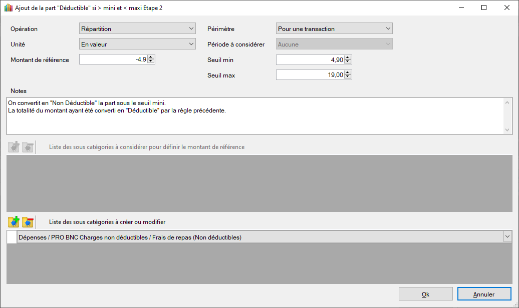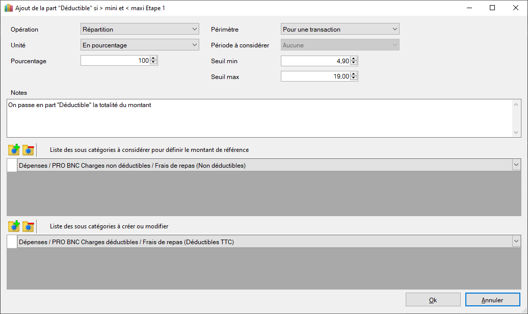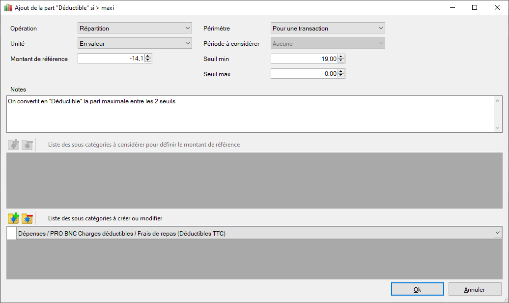 Définir le profil de calcul et de répartition suivant à partir des catégories créées et des seuils mini et maxi de déductibilité. Les seuils et les montants sont à actualiser chaque année sur les 3 règles