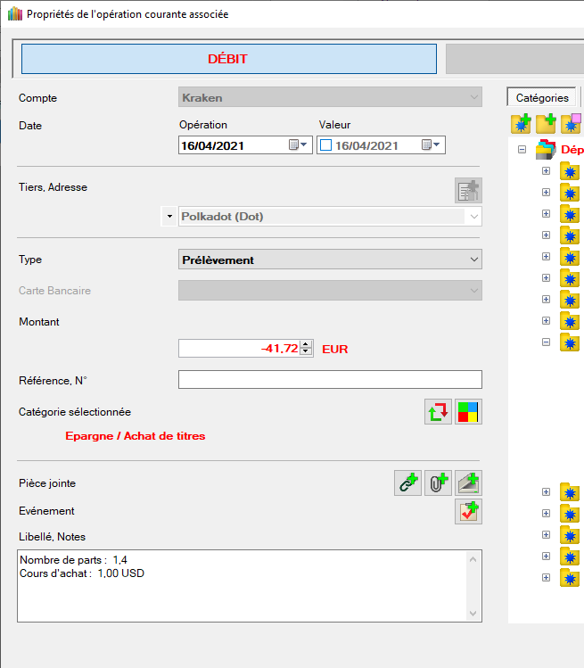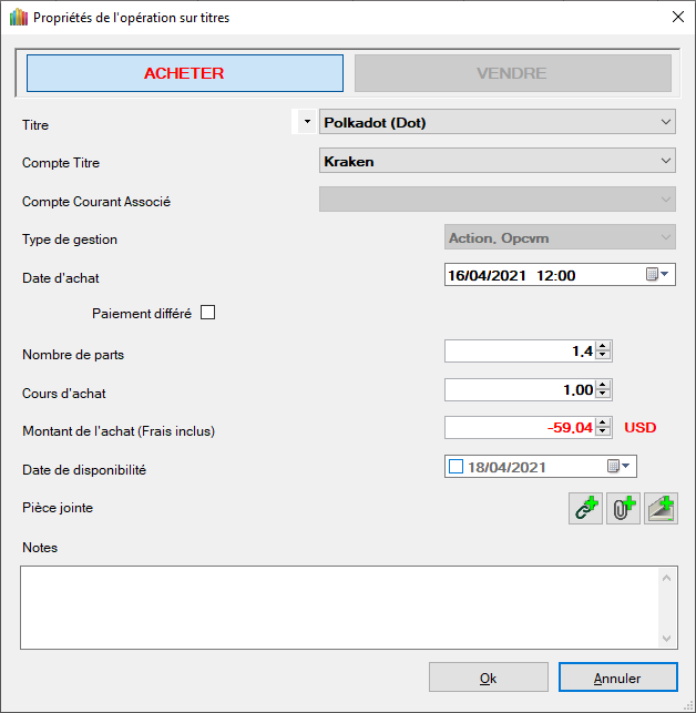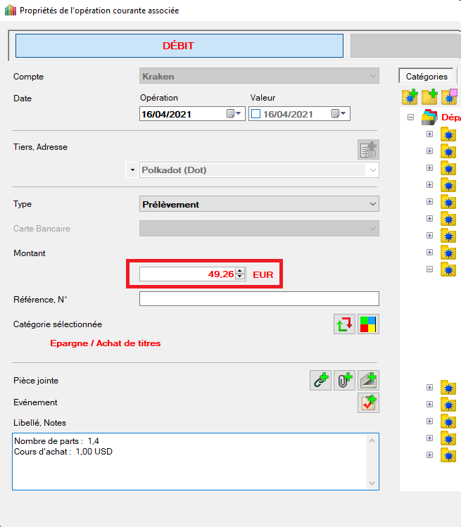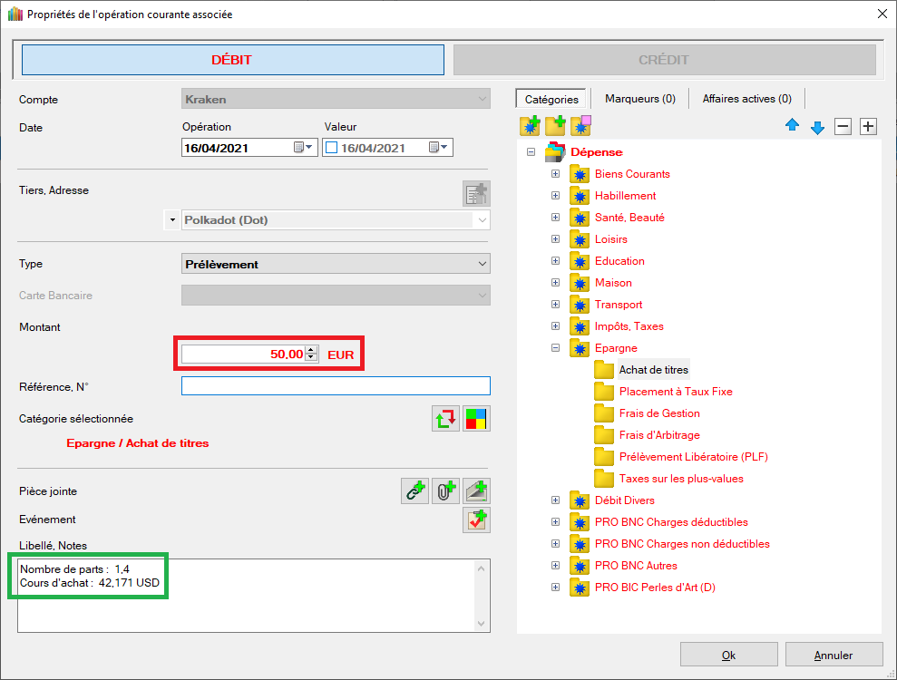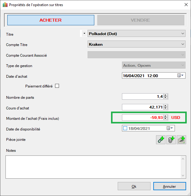 - Définir le montant de l'opération avec frais à 50 EUR Note : On constate que l'opération à bien pris en compte la valeur du cours d'achat dans les notes.