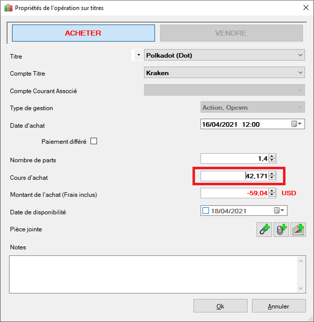 - Définisser le cours d'achat comme le montant d'achat divisé par le nb de parts = 59.04 / 1.4 = 42.171 USD