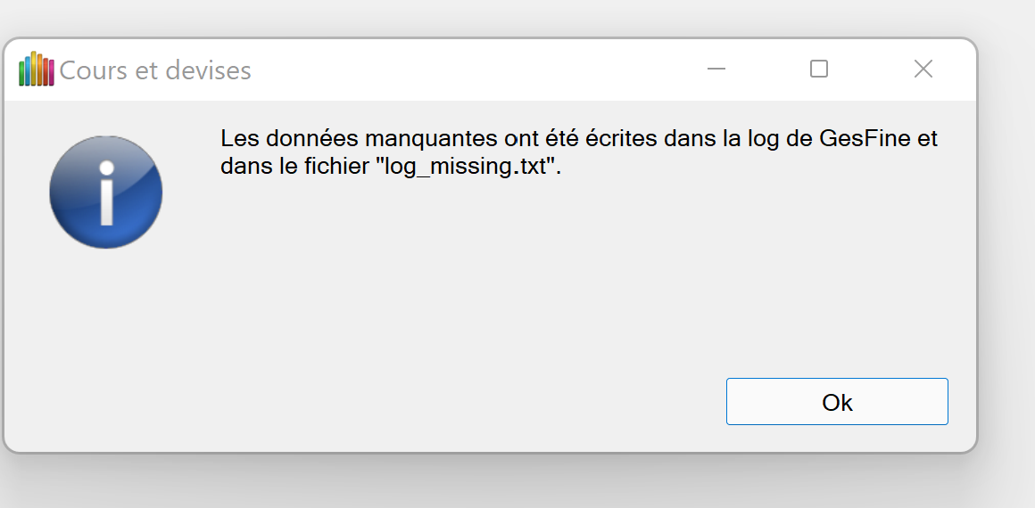 Peux-tu aussi lancer le contrôle des cours et devises manquantes depuis le menu "Options/Préférences", rubrique "Cours et devises" et me copier le résultat ici ?