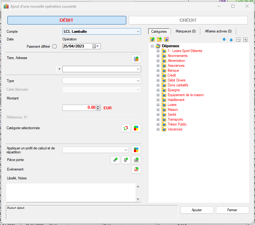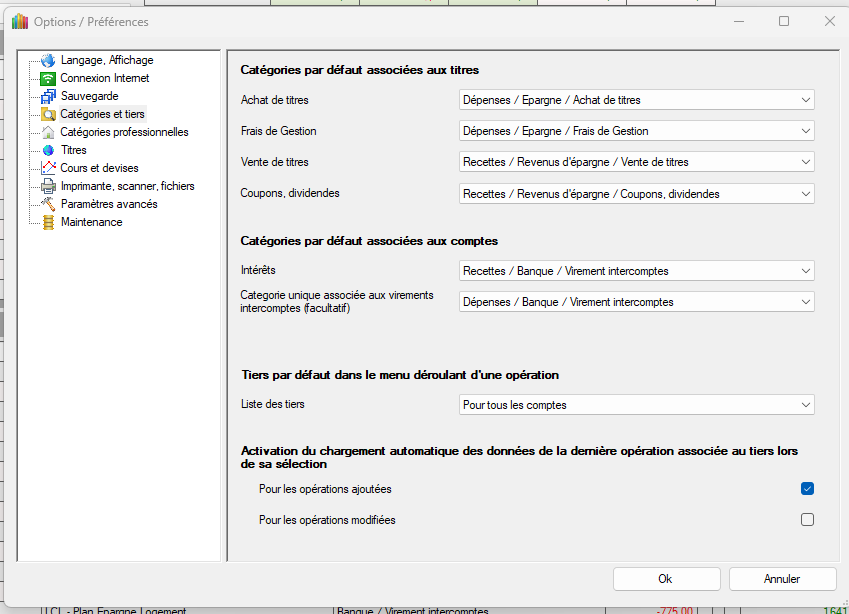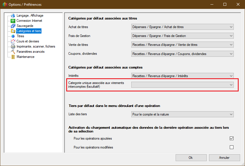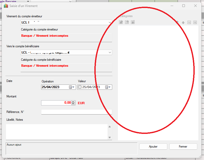 Lors d'un opération de virement entre 2 comptes, je viens de m'apercevoir que les 'Catégories' n'apparaissent pas. Donc je ne peux pas effectué de virement. Par contre lors d'un ajout d'opération ceux-ci apparaissent. Cordialement. Louis