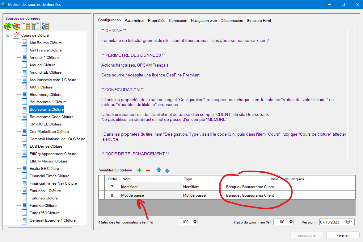 - Onglet configuration de la source "Boursorama Clôture"