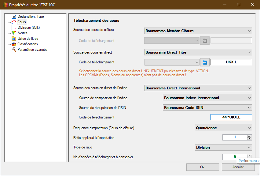 Tu vas pouvoir modifier en masse la source de clôture en "affichant le tableau des propriétés des titres de la liste sélectionnée..." en l'occurence "Ftse 100" et dans le tableau affiché, tu pourras à l'aide d'un clic droit affecté une nouvelle source de clôture, soit "Yahoo Nav Clôture".