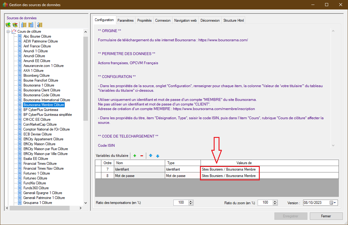 Pour ton premier message, les identifiant et mot de passe ne sont pas enregistrés sur la source "Boursorama Membre Clôture" comme ci-dessous :