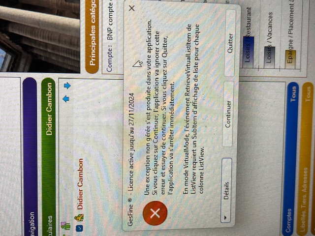 au lancement de Gesfine ce matin (1er février, changement de mois?) le logiciel se lance mais un message apparaît qui parle de "exception non gérée s'est produite" et plus rien ne fonctionne ! voici une photo du message reçu.