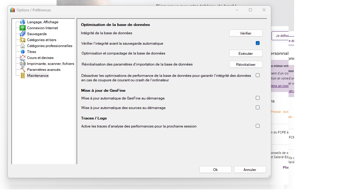 Dans les Options/Préférences, rubrique Maintenance, recoche l'option, ferme GesFine et relance le.