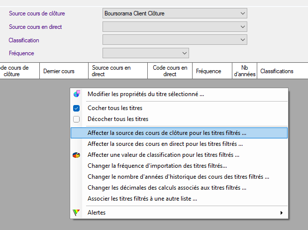 Dans la fenêtre qui s'affiche tu filtres par la source "Boursorama Clients Clôture" et dans la liste obtenue, un clic droit et tu choisis "Affecter la source des cours de clôture pour les titres filtrés..."
