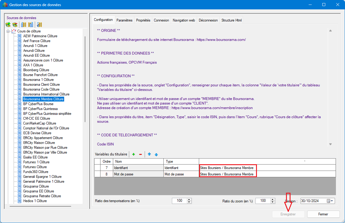 Tout est dans le message, as tu sélectionné la fiche de ton identifiant et mot de passe de membre Boursorama (fiche précédemment créée dans le module "Identifiants et mots de passe") dans la configuration de la source. Quand tu l'auras fait, la navigation fonctionnera.Alsagone a écrit : 12 novembre 2024, 17:59 Veuillez vous assurer que les variables de votre titulaire soient définies dans la configuration de la source de données et qu'il soit coché dans le bandeau de sélection.