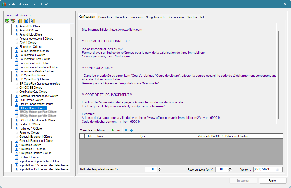 Lis bien les notes de la source pour effectuer sa configuration.hasy a écrit : 26 juillet 2025, 18:19 1 - Comment dois-je configurer le titre maison principale pour l'Isle sur la Sorgue (code postal 84800), pour actualiser la valeur de mon bien immobilier avec Efficity Maison Clôture?