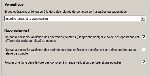 Sinon si tu choisis la valeur "Message d'alerte" sur l'item "Verrouillage", alors il te sera possible de valider/rapprocher (sous acceptation du message) avec des opérations non pointées sur la période du relevé.