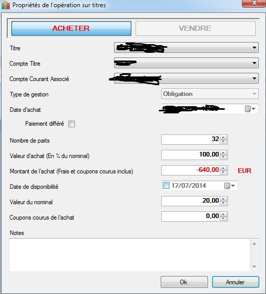 Pour leur achat, je remplis le formulaire de la façon suivante : Il s'agit donc, pour cet exemple, de 32 parts (que j'ai assimilé à des obligations... j'ai bon ?) à 20€/part, sans frais.