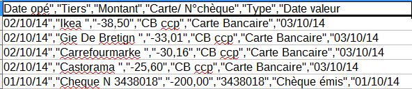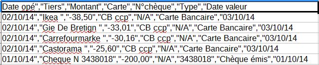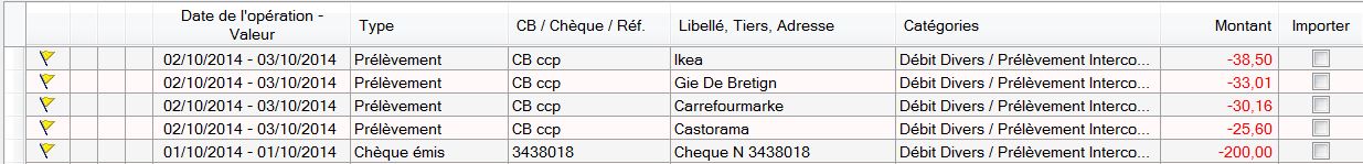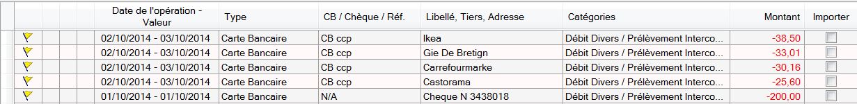 Fichier csv d'import : Format d'importation : Résultat de l'importation : Tout est OK sauf le type "Carte Bancaire" ? J'ai vérifié la bonne lecture par Gesfine du type "Carte Bancaire" en créant une règle (si type = "Carte Bancaire";montant = 0) qui marche bien. Je ne comprends pas où est la bétise ?