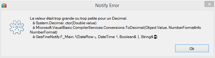 En regardant le code, s'il s'agit d'un dépassement de capacité, je ne comprend pas pourquoi le problème n'est pas apparu dès la fonction d'importation, avant même la restitution dans les modules de GesFine. Quand je simule un nombre décimal importé hors capacité, l'erreur est détectée bien avant et la valeur 0 est remonté dans les modules.