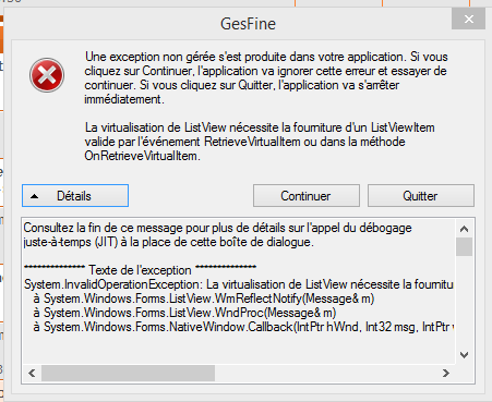 Dans le menu gestion des titres, le court en direct bloque GesFine avec le message d'erreur