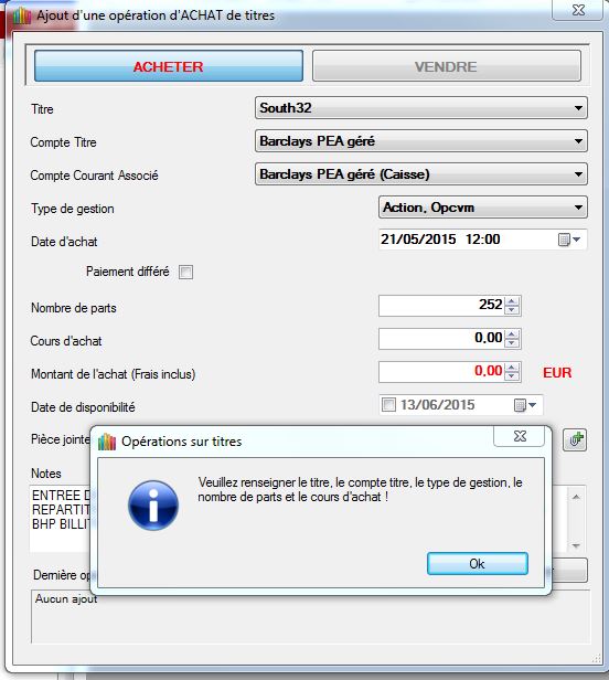 Quelques exemples valant mieux qu'un long discours (imprécis), les deux opérations infra font respectivement référence au transfert d'actions CNH et SOUTH 32. Comme il n'y a pas de cours d'achat proprement dit, j'ai pensé passer par "Ajouter des parts". Or n'en possédant pas à la date du transfert, GESFINE refuse logiquement l'opération...