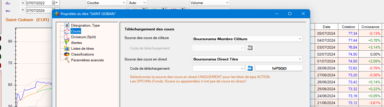 Puis demande l'importation des cours depuis le module "Analyse Graphique" en ayant coché le titre St Gobain FR0000125007 et vérifie que tu te connectes bien en tant que membre au site Boursorama.