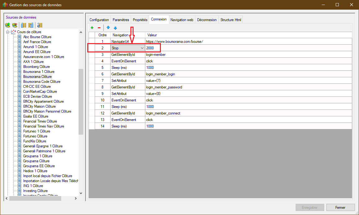 J'ai ensuite remplacé le "STOP" par "SLEEP", et ça fonctionne mais j'ai du mettre 30000 ms pour que ça ait le temps de me loguer à mon espace Boursorama Membre.... J'ai l'impression que le bandeau de pub du haut de la page d'accueil de Boursorama prend un temps fou à s'afficher....