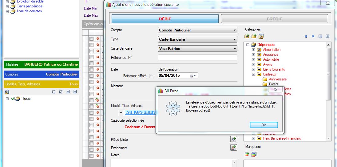 Je te fais part d'une anomalie non bloquante lors de l'ajout d'une nouvelle opération courante de débit (moyen de paiement carte bleue) avec le build 5571 lorsque les tiers ne sont pas groupés par nature :