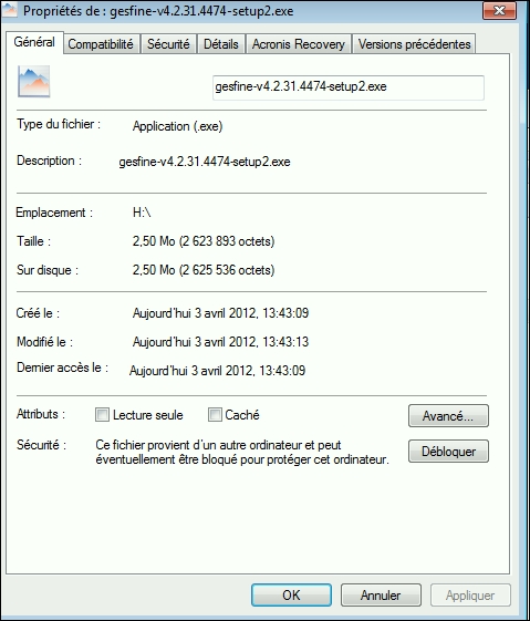 N'est ce pas plutôt lié à ton antivirus qui verrouille le fichier exe ? Je n'ai pas vu d'option semblable de mon coté dans windows 7RG a écrit :il y avait de options supplémentaires signalant que le fichier venait d'un autre site et une option de débloquage. j'ai donc débloqué.