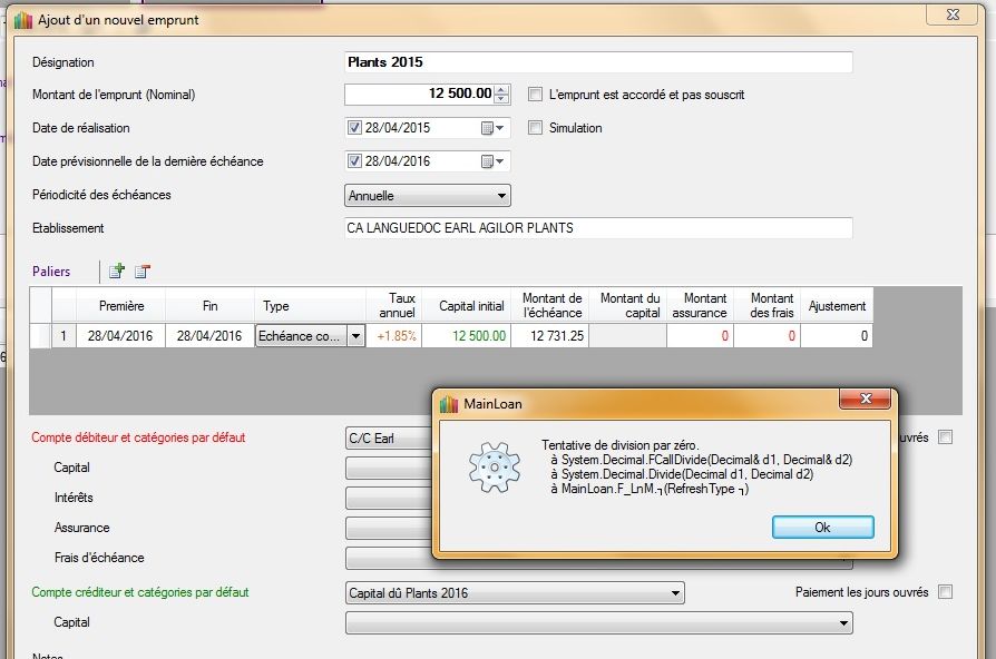 Lors de la création du 1er palier je saisi toutes les données demandées (enfin je pense), je choisis les comptes débiteurs et créditeurs et quand je valide j'ai un message d'erreur qui me dit "Tentative de division par zéro" suivi de lignes incompréhensibles(Ci-jointe capture d'écran). Je valide le message, la boite se ferme mais l'échéance n'est pas générée dans les op périodiques. J'ai essayé la méthode du prêt in fine mais je n'y suis pas arrivé. J'ai un message qui me dit qu'il faut compléter les données manquantes dans les paliers sauf qu'il y a des cases grisées que je ne peux pas remplir. J'ai fini par créer une opération courante classique qui fonctionne bien sûr, mais ce n'est pas un prêt.