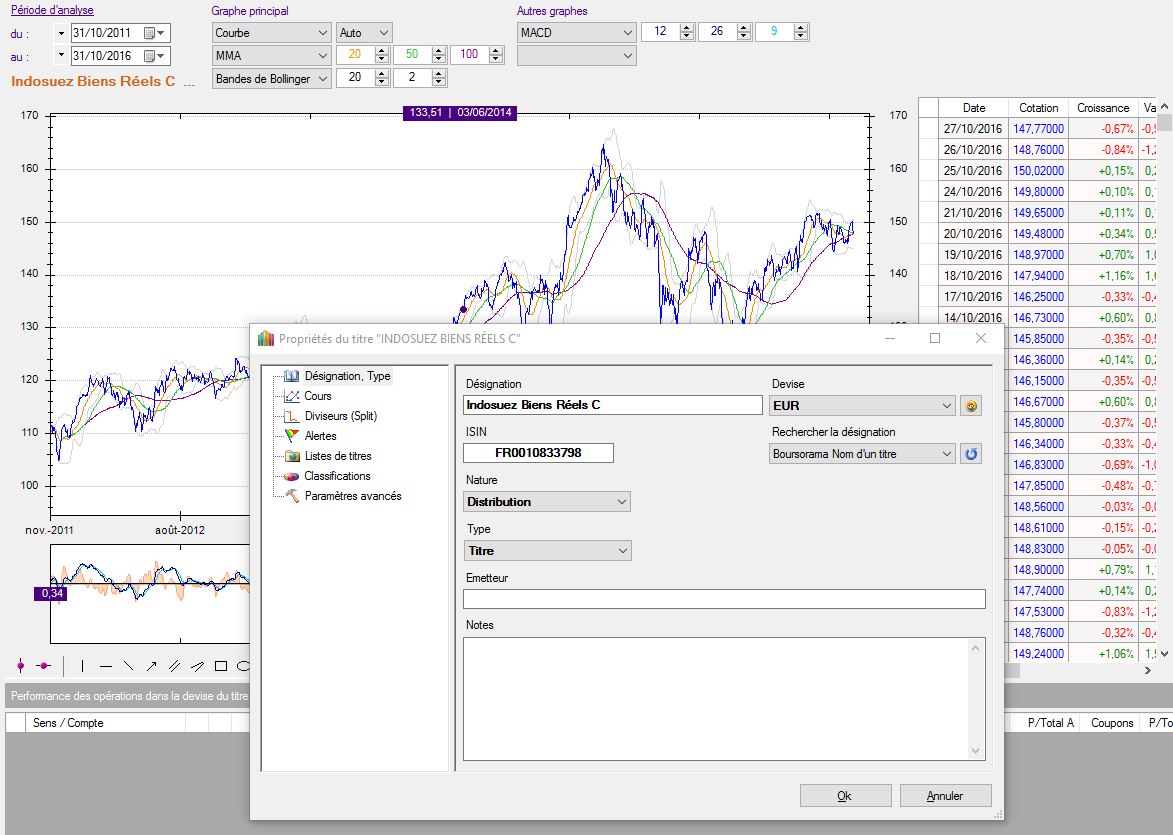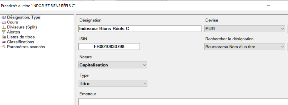 Après test, aucun problème pour récupérer les cours de "Indosuez Biens Réels C" code ISIN "FR0010833798" avec Boursorama clôture Pour ce titre qui est une SICAV, il n'existe pas de cours en direct, ne saisir que les cours de clôture avec Boursorama
