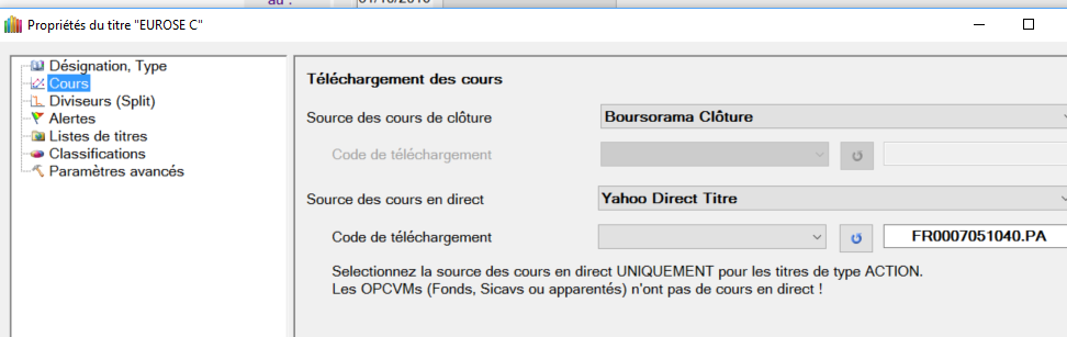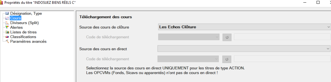 Car pour les cours de clôture, ces sources utilisent le code ISIN que tu dois renseigner dans les propriétés du titre. Il n'y a donc pas de code de téléchargement supplémentaire à renseigner, le champ est grisé.Kerni29 a écrit :quand je sélectionne Boursorama ou Echos clôture je ne peux pas accéder aux code de téléchargement.