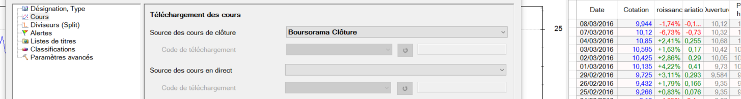 Suivant ton exemple Patrice je souhaiterais avoir le détail pour les cours, quand je sélectionne Boursorama ou Echos clôture je ne peux pas accéder aux code de téléchargement. Pour ce titre j'avais les cours jusqu'au 16/11/2015, je ne comprends pas pourquoi cela ne fonctionne plus. J'ai d'autres titres qui se sont arrêtés au 7/03/2016. Je n'ai rien modifié, je n'ai fais que mettre à jour les nouvelles versions.