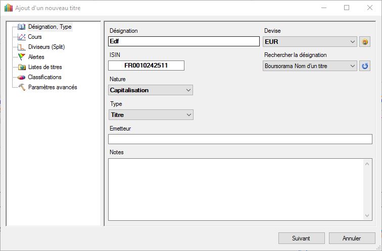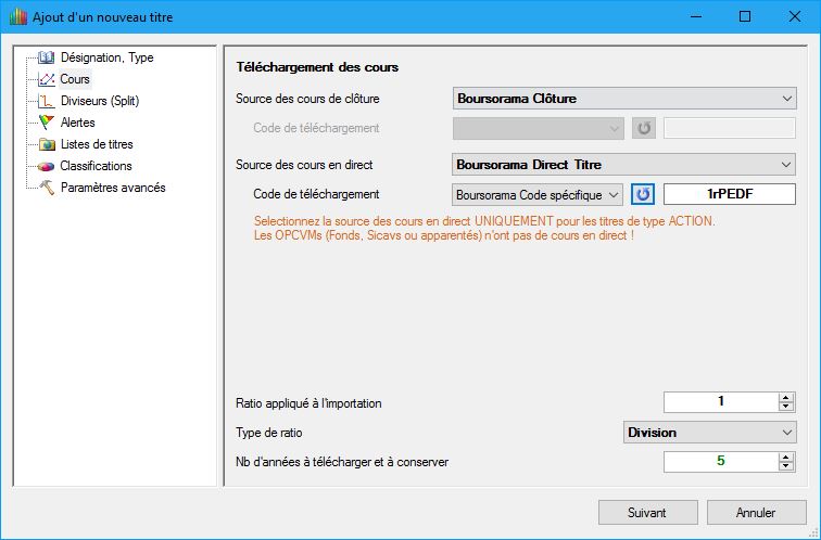 Pour EDF comme c'est une action, tu peux sélectionner la source "Boursorama Direct Titre" comme source pour les cours en direct. Puis tu recherches le code de téléchargement associé grâce à la source "Boursorama Code spécifique" (le code est 1rPEDF si tu n'y arrives pas).