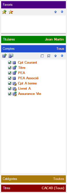 - un tout nouveau "bandeau de sélection" sera créé, avec une meilleure visibilité sur les différentes données (Titulaire, compte, catégories, titres etc...) ainsi que sur les données sélectionnées. Il devrait aussi intégrer une zone "Favoris" pour une sélection rapide des modules les plus utilisés.