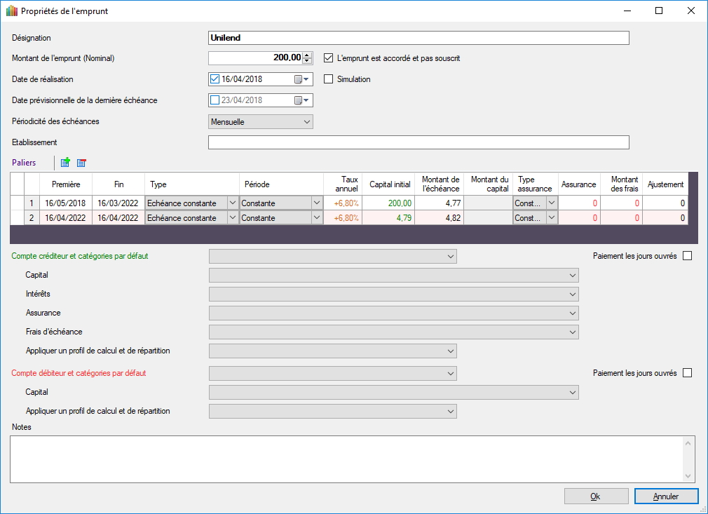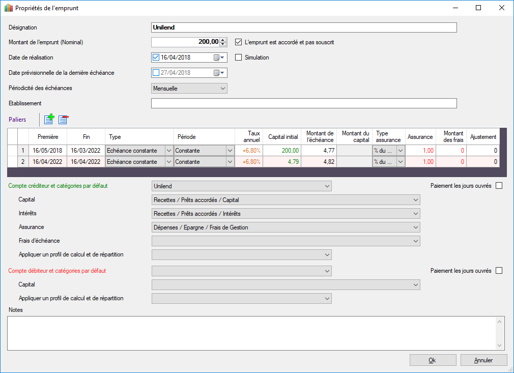 Je souscrit à des opérations de prêts chez Unilend. GESFINE permet de gérer un prêt avec un tableau d'amortissement comme un emprunt en cochant la case l'emprunt est accordé et pas souscrit. Une difficulté toutefois car dans ce cas Capital et intérêts sont bien en compte créditeur par contre il les frais d'échéance (ici prélèvement forfaitaire, CSG, CRDS..) sont dans la catégorie des débits. Je ne vois pas bien comment faire?
