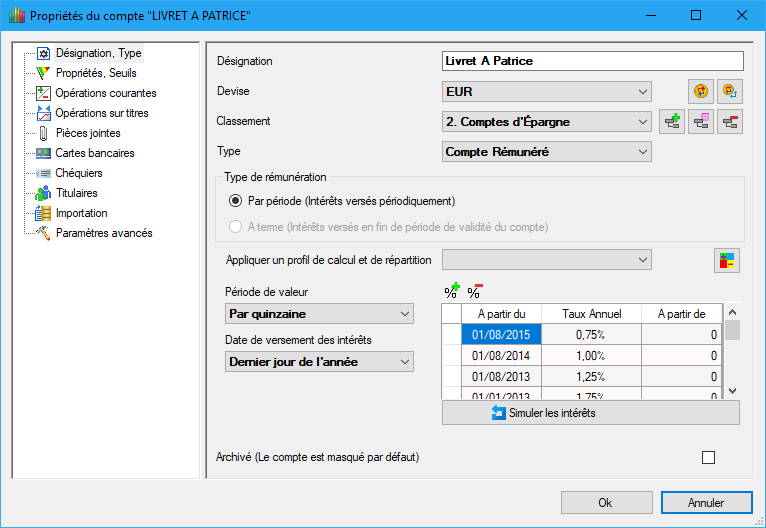 à la création d'un compte -si on le définit comme rémunéré- le paramétrage (taux, fréquence de valorisation des intérêts...) permet à Gesfine de calculer automatiquement les intérêts de fin d'année sous forme d'une opération de crédit. Dans votre cas je pense que vous pouvez reprendre les propriétés du compte (clic droit / modifier les propriétés...) et obtenir ce que vous voulez ;)