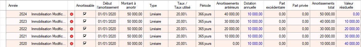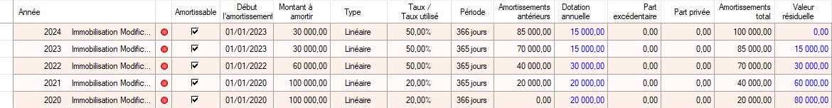 - Un taux linéaire de 50% afin de créer un amortissement de 30 000€ en 2022 [20 000 initiaux + 10 000 supplémentaires] afin de constater une valeur résiduelle de 30 000€ en fin d'année 2022