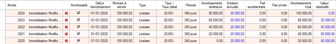 Création d'un premier palier avec un taux linéaire de 20% (Amortissement prévu sur 5 ans) [1 / 5 x 100 = 20%] Ce qui donne le tableau d'amortissement suivant : - Amortissement après révision