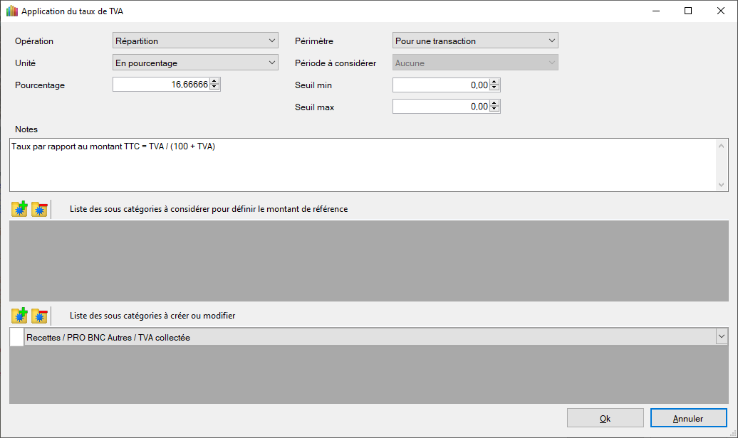 L'exemple est donné pour une TVA de 20% sur les recettes. Pour une application sur la TVA des dépenses, créer un profil similaire en remplaçant la catégorie de TVA des recettes par celle des dépenses.