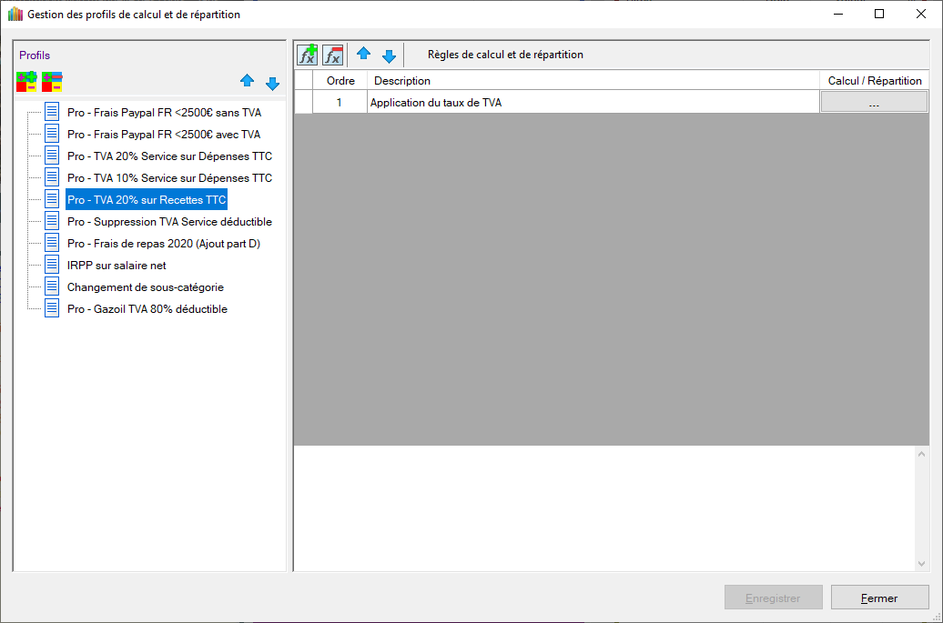 Définir le profil de calcul et de répartition suivant à partir de la catégorie créée et du % de la TVA.