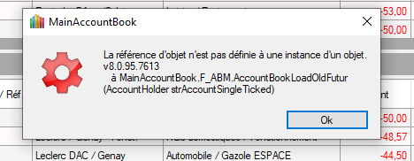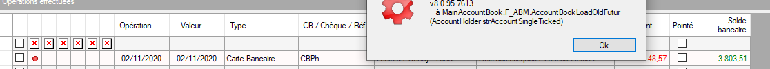 Après lancement de gesfine et intégration auto de la dernière MàJ (8.0.95.7613) , puis choix d'ouverture du module "livre de comptes", puis "clic" sur une opération (que je voulais modifier), le critère de choix étant alors "date de valeur" (valeur autoaffichée). Je bascule sur "date d'opération" j'ai alors le message d'erreur ci-après: