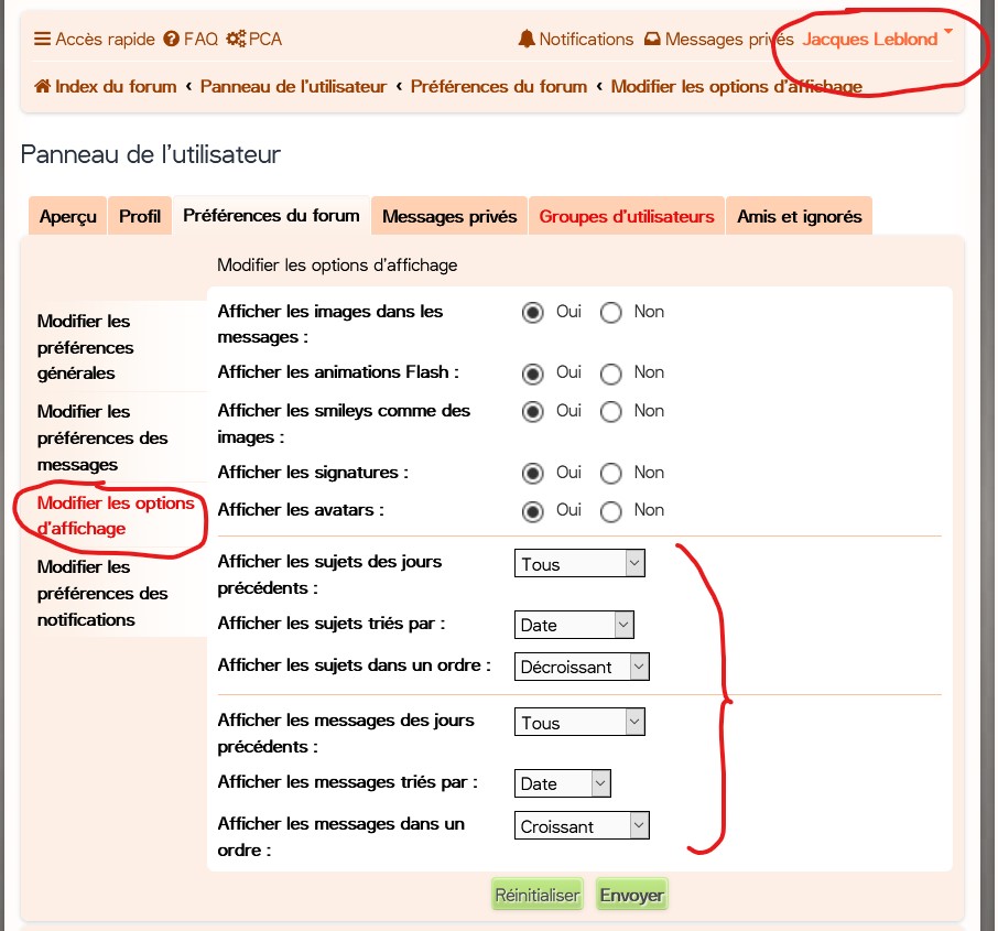 Voici mes réglages sur le forum, accessibles en haut à droite sous ton nom avec le "Panneau de l'utilisateur/Préférences du forum/Modifier les options d'affichage".