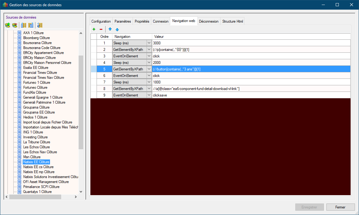 Par le menu "Configuration/Gestion des sources de données", tu vas te positionner sur la source "Natixis EE Clôture" comme sur la copie écran ci-après : A la ligne 5, tu vas remplacer :