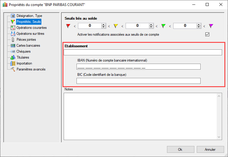 Je viens de constater que la partie "Propriétés, Seuils" des propriétés de mes comptes ne permettait pas (ou plus) de sauvegarder le nom de l'établissement, l'IBAN et et BIC. Si l'on remplit ces champs, que l'on clique OK, puis qu'on retourne dans cet onglet, on constate que les données saisies ont disparu.
