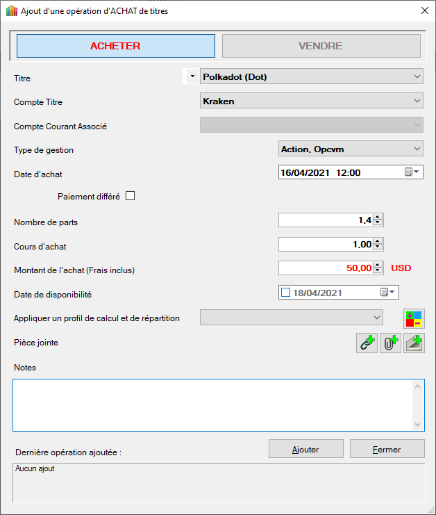 - Définir le montant de l'opération avec frais à 50 EUR Note : On constate que l'opération à bien pris en compte la valeur du cours d'achat dans les notes.