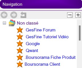 "Navigation" et "Favoris" sont 2 choses très différentes, les favoris ne concernent que les modules de GesFine, ils mémorisent les critères de tri des modules et du bandeau de sélection, il n'est pas possible d'en faire pour des pages internet issues de la Navigation.Biollay74 a écrit : 26 mars 2024, 18:59 est-ce possible d'ajouter (ou supprimer) des onglets dans la navigation --> ou bien faut il passer par les favoris ?