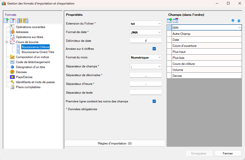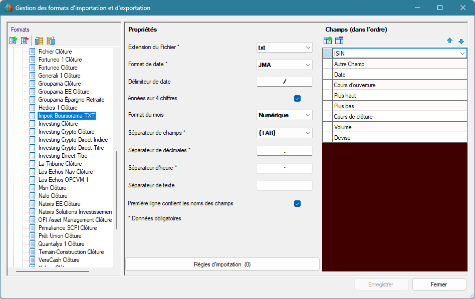 Pour répondre à ta question, tu ne dois pas utiliser le format "Boursorama Clôture" qui est réservé à la source d'importation "Boursorama Membre Clôture" que tu ne dois absolument pas modifier. Source que tu pourrais utliser si tu as un identifiant en tant que membre.
