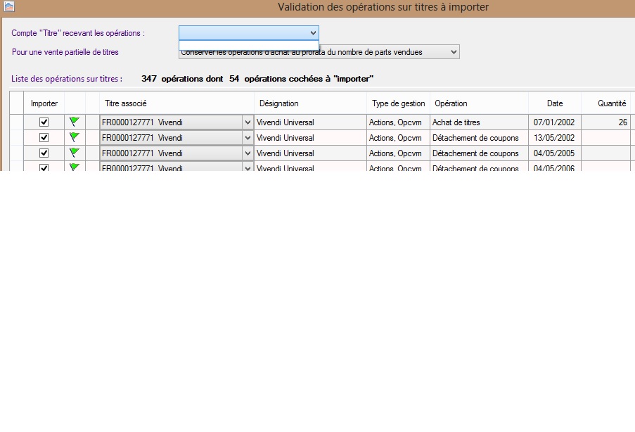 je suis comme beaucoup un utilisateur de Money depuis de longues années en désarroi devant la perte du chargement des cours depuis juillet 2013. Je suis donc à la recherche d'une solution alternative et lors des recherches de solution je suis tomber sur votre programme qui me semble très intéressant. Bien sur J'aimerais garder mon historique de Money. Lors de mes phases d'essai aucun problème pour le chargement des comptes plusieurs milliers de lignes récupérées en 2 temps 3 mouvements. Par contre concernant les titres, la liste des titres dans la phase final d'import reste désespérément vide j'ai du raté quelque chose et je but sur ce point m’empêchant d'aller plus avant